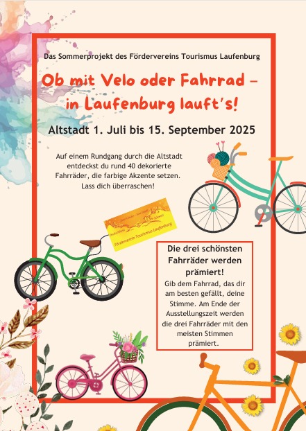 Laufenburg erstrahlt diesen Sommer in bunten Farben – dank eines kreativen Fahrrad-Projekts, das vom 1. Juli bis zum 15. September stattfindet. Unter dem Motto "Ob mit Velo oder Fahrrad – in Laufenburg lauft’s!" lud der Förderverein Tourismus Laufenburg ein alte, ausgediente Fahrräder in kleine Kunstwerke zu verwandeln. Diese tragen nun zur sommerlichen Belebung der Altstadt bei.